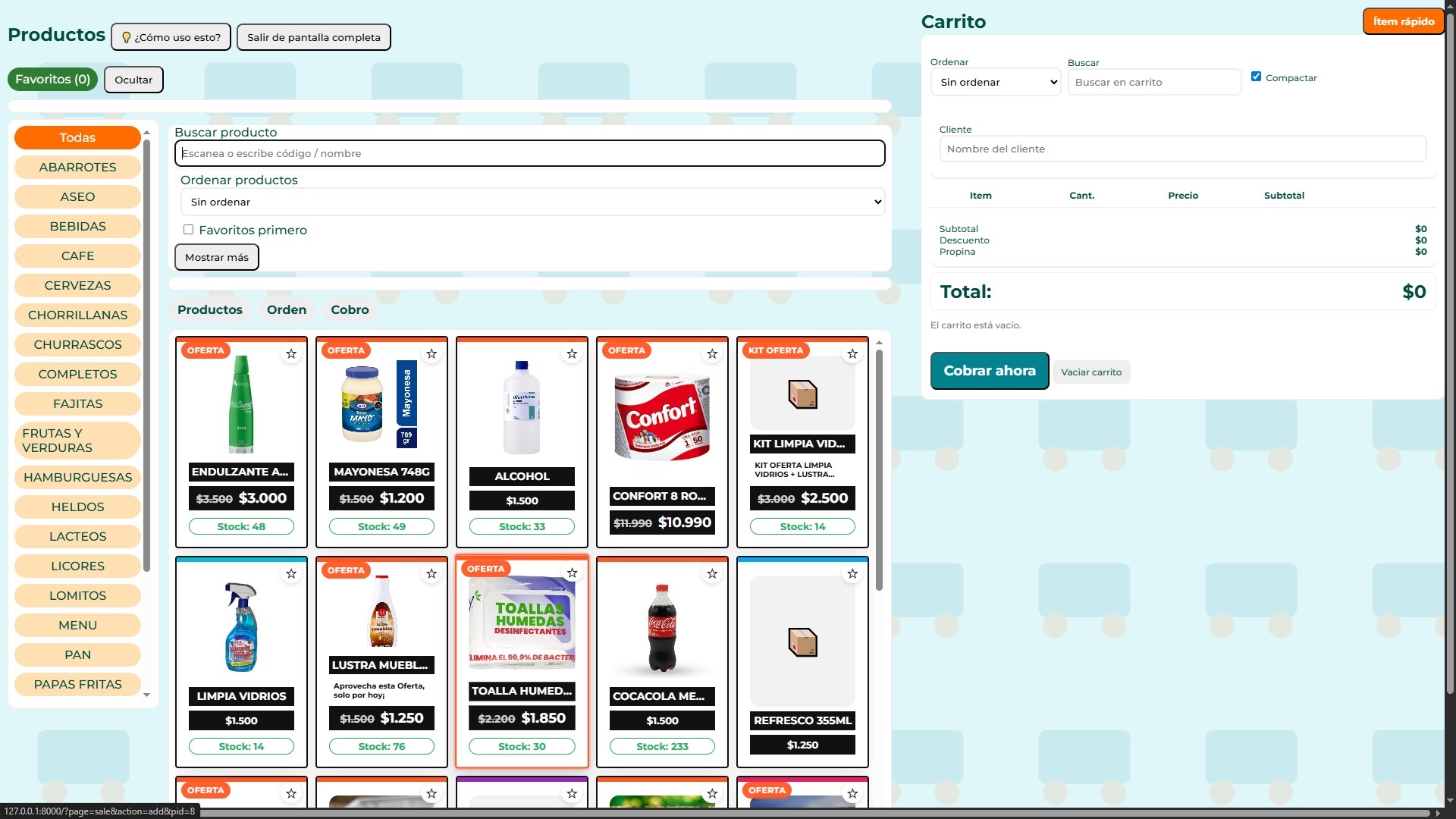 Productos por categoría, favoritos, búsqueda y cobro en pocos pasos.